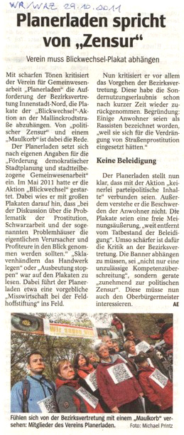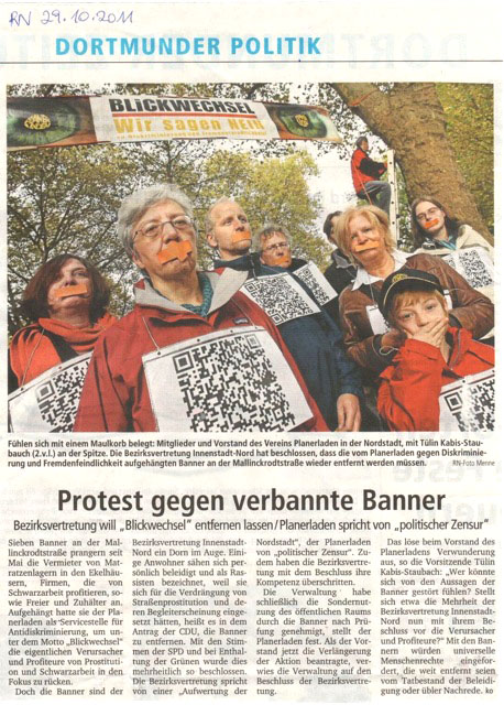 Bei der Beantragung der Verlängerung dieser Aktion im öffentlichen Raum teilte die Verwaltung nun mit, dass die Bezirksvertretung Innenstadt-Nord auf ihrer Sitzung am 28.09.11 mehrheitlich beschlossen habe, die an der Mallinckrodtstraße aufgehängten 7 Banner entfernen zu lassen. Im Antrag der CDU, der mit Stimmen der SPD sowie bei Enthaltung von Bündnis90/DIE GRÜNEN beschlossen wurde, wird dies damit begründet, dass sich einige Anwohner als Rassisten bezeichnet sähen, weil sie sich für die Verdrängung von Straßenprostitution und deren Begleiterscheinungen eingesetzt hätten. Nur zur Klarstellung dieser Absurdität: Der Planerladen e.V. hat bereits 2001 bei der Diskussion um die Einrichtung eines Straßenstrichs in der Ravensburger Straße und somit der Aufweichung des Sperrbezirks die Position vertreten, dass Prostitution in unmittelbarer Nähe eines Wohngebietes nichts verloren hat.